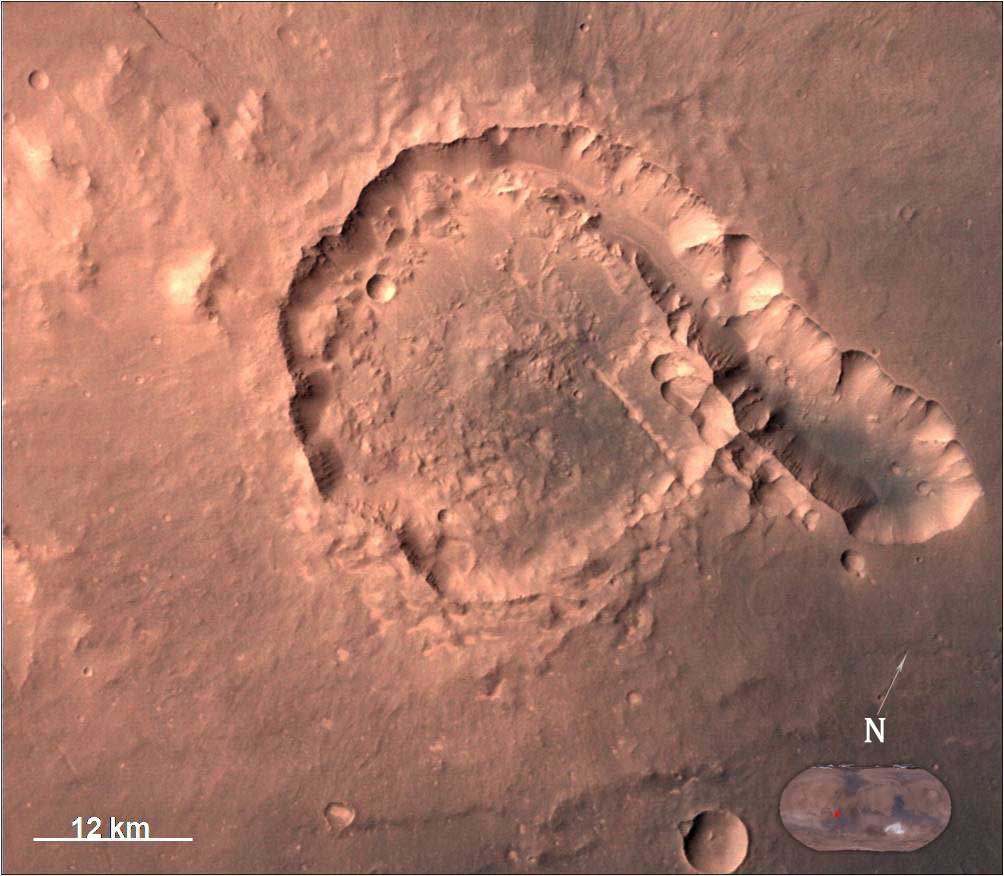 Il cratere da impatto Pital, nella regione Ophir Planum, fotografato dalla Mars Color Camera il 23 aprile 2015 da 808 km. Crediti: ISRO