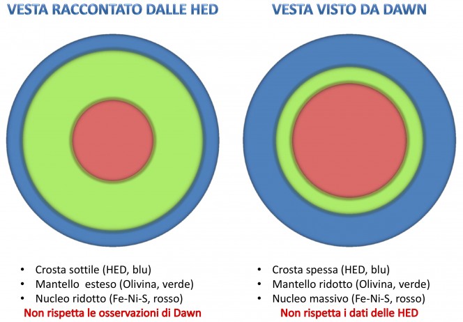 «Il problema nasce quando mettiamo insieme i dati osservativi forniti dalle meteoriti con quelli di Dawn: la visione classica di Vesta diventa allora una coperta corta che non riesce a spiegarli tutti» spiegano gli autori. «Ad esempio: il grande nucleo di Vesta misurato da Dawn contiene una larga parte del ferro che dovrebbe esserci nell’asteroide, ma sulla base dei dati delle HED anche la spessa crosta rivelata da Dawn ne contiene notevoli quantità. Il ferro a disposizione di Vesta, però, non è infinito, ma è limitato dalle abbondanze cosmiche. Se la maggior parte del ferro è intrappolata nel nucleo e nella crosta, per esclusione il mantello di Vesta dovrebbe essere composto di olivina contenente magnesio anziché ferro. Questo tipo di olivina, però, ha una densità più bassa di quella della sua controparte basata sul ferro, il che ci pone di fronte a un nuovo problema. Se adottiamo la densità corretta per il mantello di Vesta, all’interno dell’asteroide non ci sarebbe abbastanza olivina da giustificare alcune caratteristiche compositive delle HED come l’abbondanza delle “terre rare”, elementi incompatibili con la composizione del mantello e del nucleo che quindi si andrebbero a concentrare nella crosta. Se invece volessimo spiegare l’abbondanza delle “terre rare”, il mantello di Vesta dovrebbe avere densità ben più alte e fisicamente inconsistenti con la composizione chimica ipotizzata»