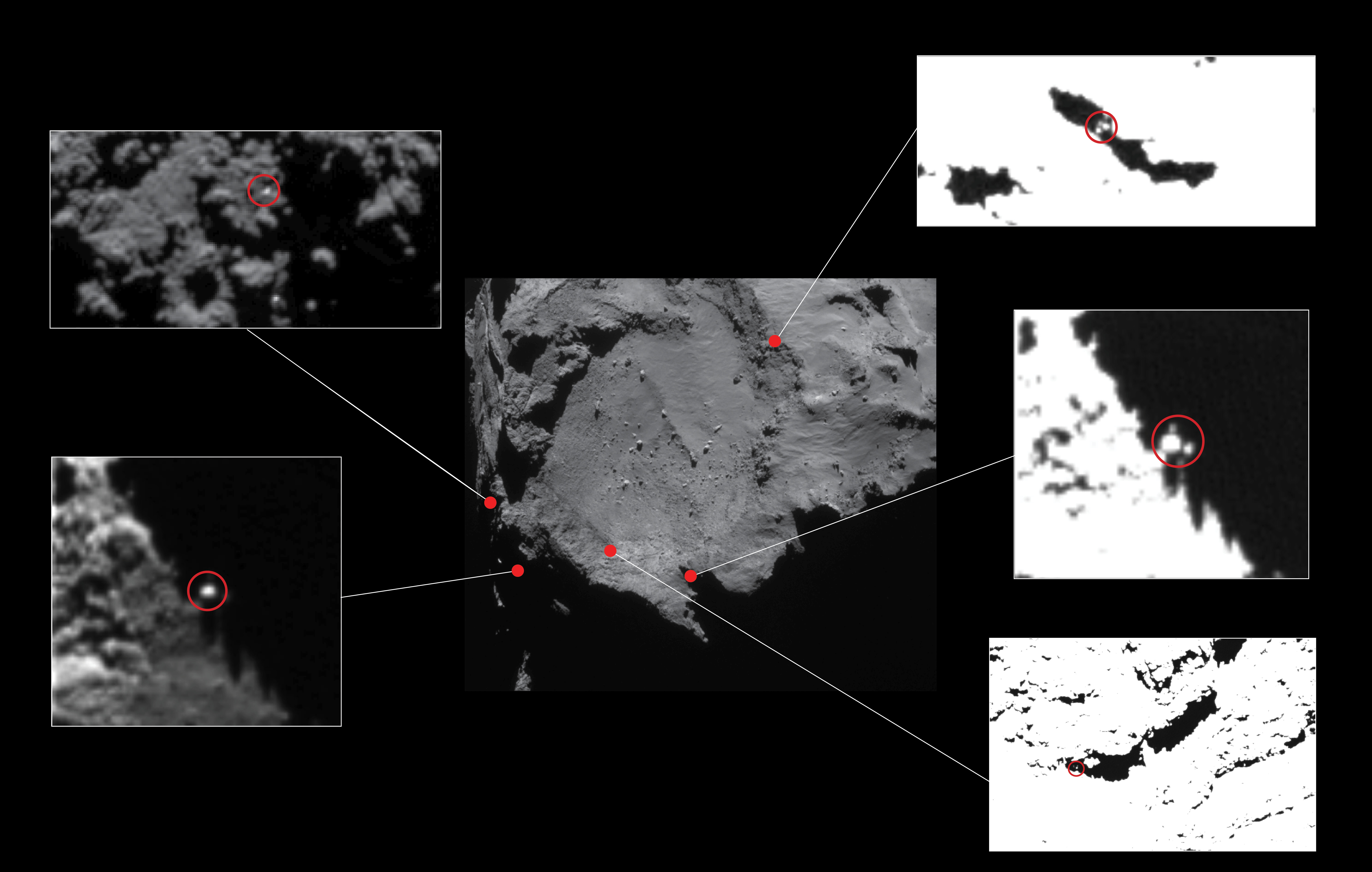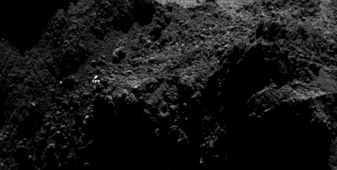 «Anche se le immagini pre e post atterraggio sono state scattate con diverse risoluzioni spaziali le informazioni topografiche locali corrispondono, fatta eccezione per un punto luminoso presente solo nelle immagini successive all’atterraggio. Proponiamo quindi questo punto come buon candidato per il lander», dice Philippe Lamy, membro del team di OSIRIS presso il Laboratoire d’Astrophysique de Marseille, che aggiunge: «Questo punto luminoso è visibile su due diverse immagini raccolte nel dicembre 2014, e questo indica chiaramente che si tratta di una reale caratteristica sulla superficie della cometa, non un artefatto dovuto al rivelatore né un granello di polvere prospetticamente in primo piano”.