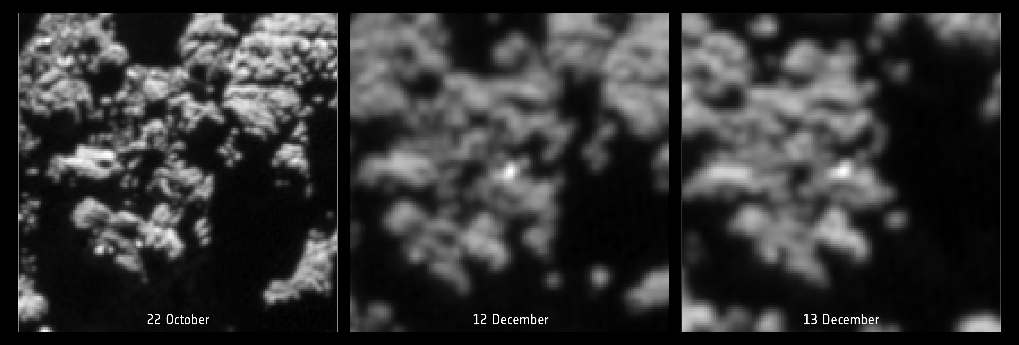 Confronto delle immagini “prima” e “dopo” del candidato promettente situato vicino l’ellisse dii CONSERT come appare nelle immagini dalla camera ad angolo stretto di OSIRIS. Ogni immagine copre circa un’area 20 x 20 m sulla cometa 67P. L’immagine a sinistra risale al 22 ottobre (prima dello sbarco di Philae) ed è stata scattata da una distanza di circa 8 km dalla superficie della cometa, mentre le immagini al centro e a destra mostrano la stessa regione osservata il 12 e il 13 dicembre (quindi dopo l’atterraggio) da una distanza di 18 km. Il candidato è visibile solo nelle due immagini successive e le condizioni di illuminazione sono molto simili nelle tre immagini. Crediti: ESA/Rosetta/MPS per il team OSIRIS MPS/UPD/LAM/IAA/SSO/INTA/UPM/DASP/IDA