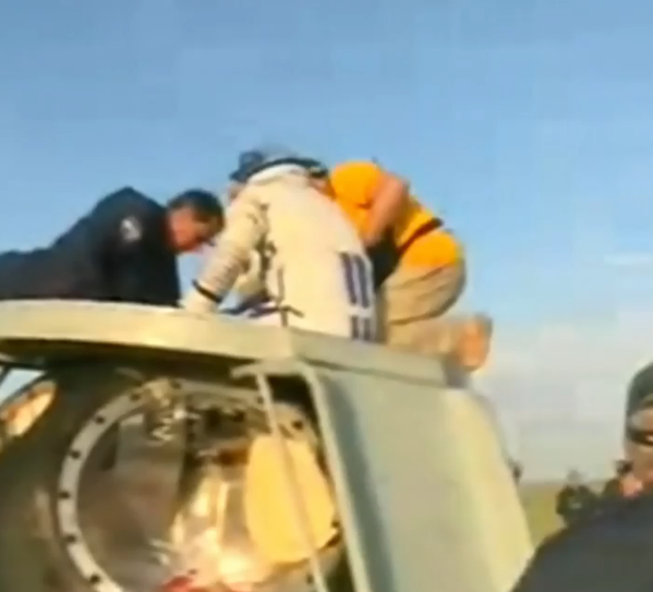 - I tre astronauti appena usciti dalla navicella Soyuz