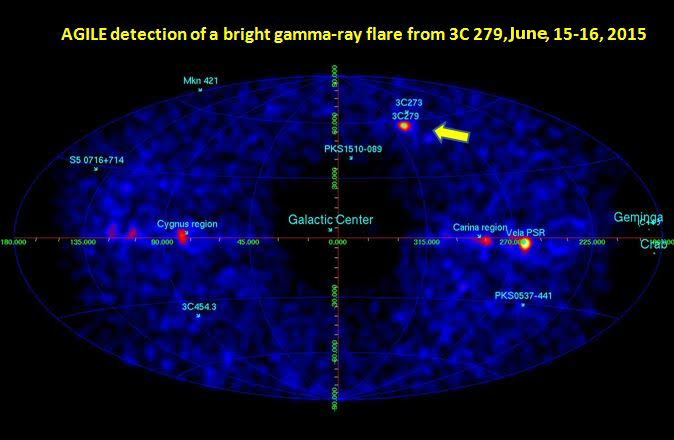 Il cielo gamma di AGILE di oggi… E’ un’immagine inconsueta quella che Media INAF vi propone: un bellissimo flare gamma visto dal quasar 3C 279, nostra vecchia conoscenza, che sta avendo attività monitorata ora da tutti i principali telescopi. Il flare gamma è stato rilevato anche dallo strumento LAT del satellite NASA Fermi anche se ad una energia maggiore. L’ultimo flare simile nel periodo 2013-2014 ha praticamente distrutto le teorie che avevamo sull’emissione da getti in buchi neri supermassivi, o quanto meno ha fatto vedere che ci sono diversi modi di emissione gamma non previsti fino a poco tempo fa. Stiamo lavorando alla teoria dei getti alla luce dei dati di 3C 279, nel frattempo vediamo questo flare come si sviluppa.