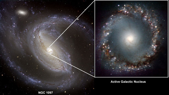 NGC 1097 dista da noi circa 50 milioni di anni luce, in direzione della costellazione della Fornace ed è anche classificata come una galassia di Seyfert, (dal nome dall’astrofisico Carl Keenan Seyfert che le scoprì nel 1943): sono simili a normali galassie a spirale, come la Via Lattea, ma presentano dei nuclei straordinariamente sviluppati e brillanti, a volte luminosi come 100 miliardi di soli (galassie attive o AGN, active galactic nuclei).