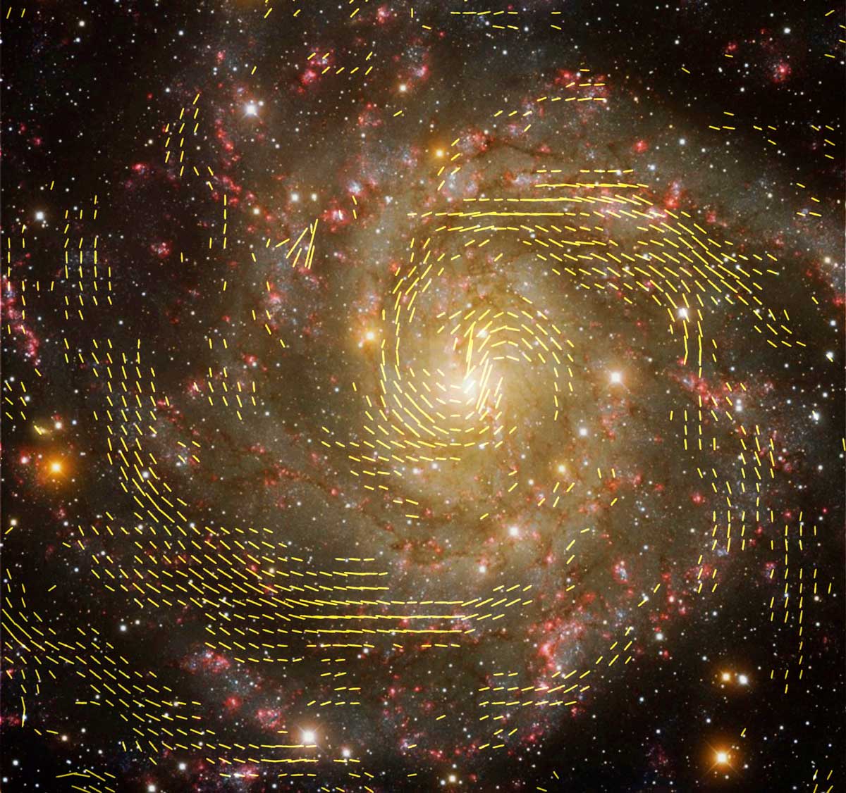 Immagine combinata di dati radio e ottici della galassia IC 342, ottenuta utilizzando i dati del VLA e del radiotelescopio di Effelsberg. Le linee indicano l’orientamento dei campi magnetici nella galassia. Crediti: R. Beck, MPIfR; NRAO/AUI/NSF; grafica: U. Klein, AIfA; Background; immagine: T.A. Rector, University of Alaska Anchorage e H. Schweiker, WIYN; NOAO/AURA/NSF