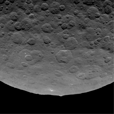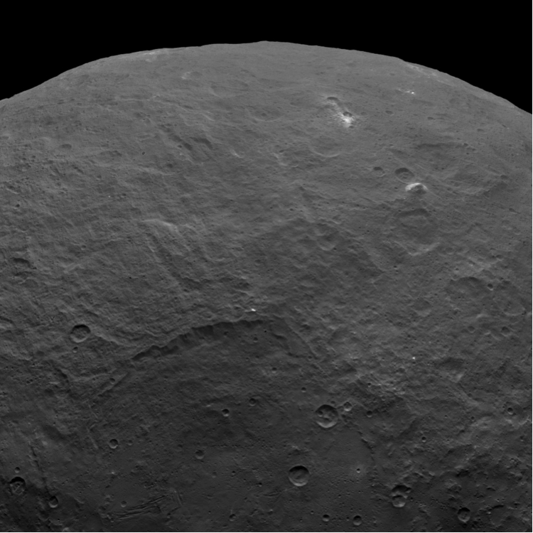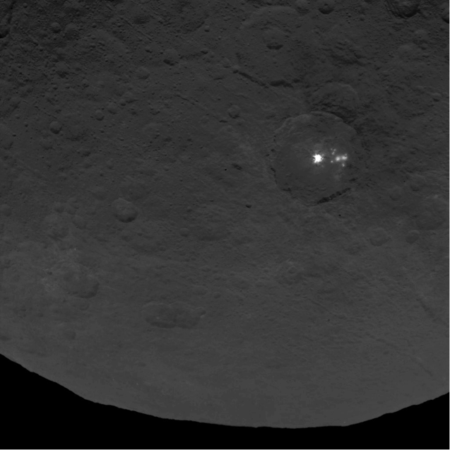 La nuova immagine scattata dalla sonda Dawn rivela che in questo cratere di circa 90 chilometri ci sono molti più bright spot rispetto a quanto osservato in precedenza (da una distanza maggiore). Ce ne sarebbero almeno 8 vicino alla macchia più grande (che gli scienziati hanno misurato in 9 chilometri). Come detto, cosa provochi questa intensa luminosità è un mistero, ma ghiaccio e depositi di sale sono le opzioni finora più quotate tra gli esperti, i quali però stanno considerando anche altre opzioni (vulcani, geyser e altro).