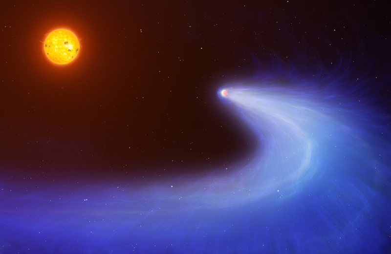 Rappresentazione artistica di GJ 436b con l’imponente strascico d’idrogeno che lo circonda e lo segue come una coda nella sua rapida rivoluzione attorno alla nana rossa. Crediti: Mark Garlick/University of Warwick