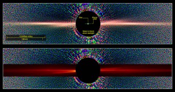 Queste immagini confrontano una vista della stella Beta Pictoris in luce diffusa come vista dal telescopio spaziale Hubble (in alto), con una vista simile costruita con i dati ottenuti grazie alla simulazione SMACK (overlay rosso, in basso).