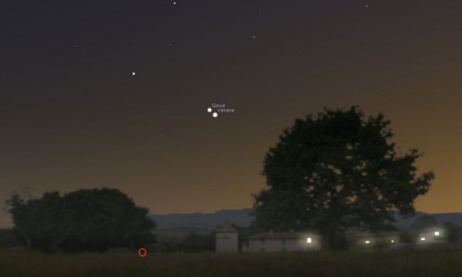 La congiunzione Venere-Giove è uno spettacolo ogni anno atteso con trepidazione da astronomi e amatori perché regala una visione diversa dei due corpi celesti. Quest’anno, rispetto al nostro punto di vista, si avvicinano fino ad una distanza inferiore al diametro della Luna.. L’anno scorso il fenomeno si era verificato il 18 agosto prima dell’alba, domani invece l’ “abbraccio” tra i due pianeti potrà essere osservato dopo il tramonto, anche se il massimo avvicinamento si verificherà alle 6 ora italiana del primo luglio. Venere e Giove saranno ben visibili dall’Italia domani sera alle 22, basterà puntare i vostri telescopi verso ovest.