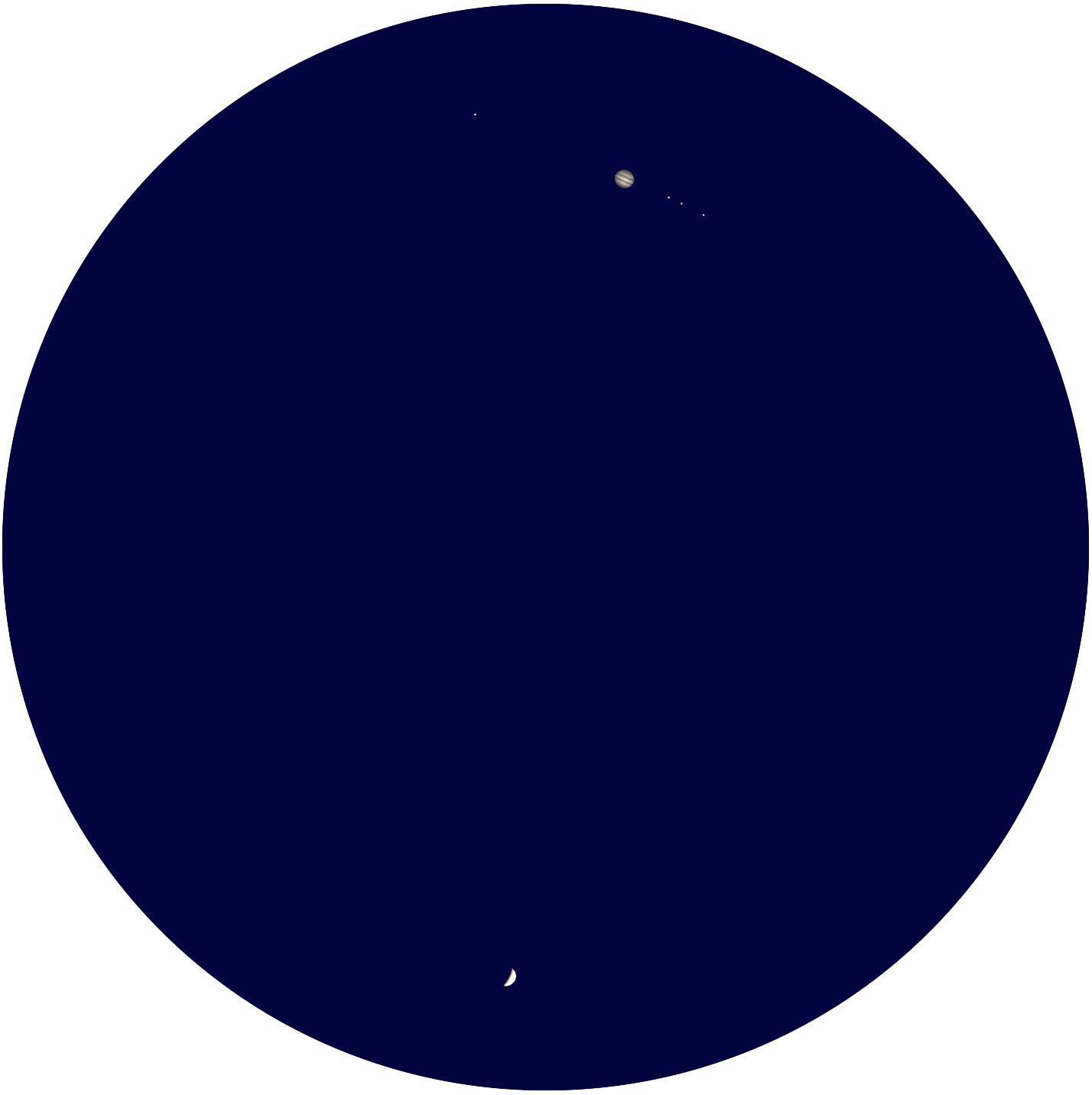 Ecco appariranno Giove (sopra) e Venere (sotto) domani 30 giugno se osservati con un telescopio amatoriale. Le lune di Giove da destra a sinistra sono Ganimede, Europa, Io e Callisto. Crediti: Stellarium
