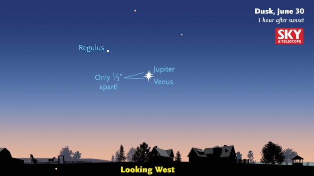 Si tratta dei due oggetti più brillanti nel nostro cielo dopo il Sole e la Luna e già da un mese il processo di congiunzione è sotto attenta osservazione. A inizio mese i due pianeti erano separati di 20° (circa il doppio della larghezza del vostro pugno tenuto a braccio teso verso il cielo) e in poche settimane si sono avvicinati sempre di più. Tra la notte del 30 giugno e del primo luglio Venere e Giove saranno distanti solo 1/3 °: se allungate un braccio verso il cielo, sarete in grado di coprire entrambi i pianeti con la sola punta del vostro mignolo. La mezzaluna di Venere apparirà molto più luminosa rispetto al più “opaco” Giove.