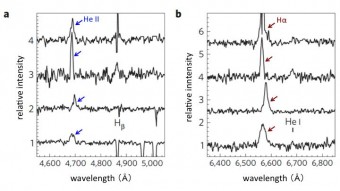 Il team di scienziati ha scoperto una caratteristica importante presente negli spettri ottici di tutte le ULX osservate. Si tratta di una linea di emissione larga dovuta a ioni di elio, che indica la presenza di gas riscaldato a temperature di diverse decine di migliaia di gradi. Inoltre, hanno scoperto che la larghezza della linea dell’idrogeno, che viene emesso da gas a temperature inferiori, pari a circa 10.000° K, è più ampia rispetto a quella dell’elio. La larghezza di una riga spettrale viene prodotta per effetto Doppler ed è causata dalla dispersione di velocità delle molecole di gas predenti nel disco. I risultati suggeriscono che il gas debba essere accelerato verso l’esterno, con un vento proveniente dal disco o dalla stella compagna, e che si stia raffreddando mentre si allontana.