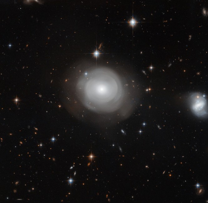 In questa immagine il telescopio orbitante di NASA/ESA Hubble ha immortalato la galassia ESO 381-12, fotografata dietro un grande numero di altre galassie. La sua struttura, come potete vedere, è irregolare, sfocata, spettrale e pallida. Il cluster di stelle che orbita attorno alla galassia ci dice che ESO 381-12 deve aver preso parte a una collisione, molto probabilmente in un periodo neanche troppo lontano. Un incidente galattico che ha portato alla formazione di un gran numero di nuove stelle.