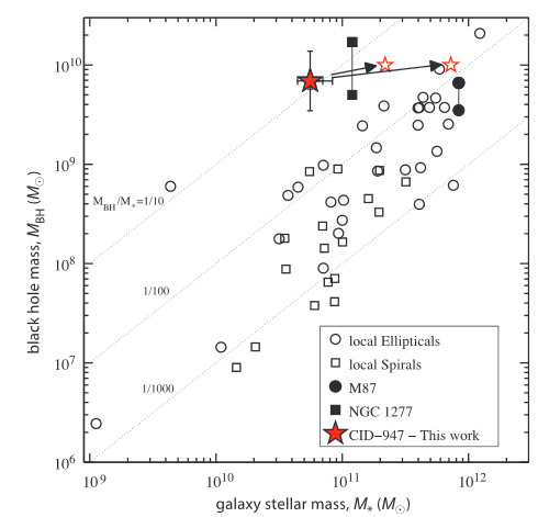Il grafico illustra l’andamento della massa del buco nero in funzione della massa stellare galattica per un insieme di oggetti distribuiti nell’universo locale. La posizione di CID-947 è indicata da una stella (in rosso). Le due galassie vicine M87 e NGC 1277 si possono considerare discendenti di CID-947. Credit: B. Trakhtenbrot et al. 2015