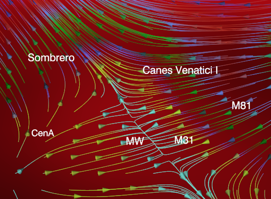 La figura mostra il flusso di galassie: quello sull’autostrada cosmica e lungo il ponte della Vergine, nella regione intorno alla Via Lattea, Andromeda e Centaurus A