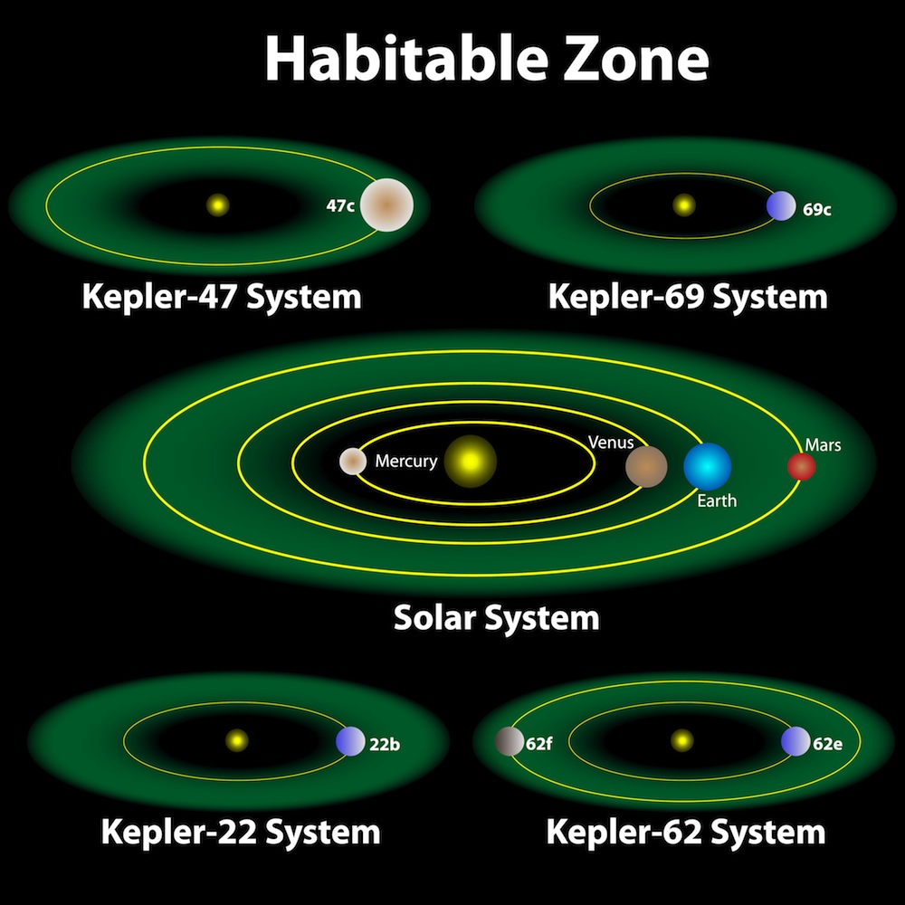 La zona abitabile dipende dalla dimensione e temperatura della stella. La figura illustra alcuni esempi di sistemi stellari scoperti da Kepler dove viene illustrata la zona abitabile e quella del Sistema solare. Credit: Milagli / Shutterstock
