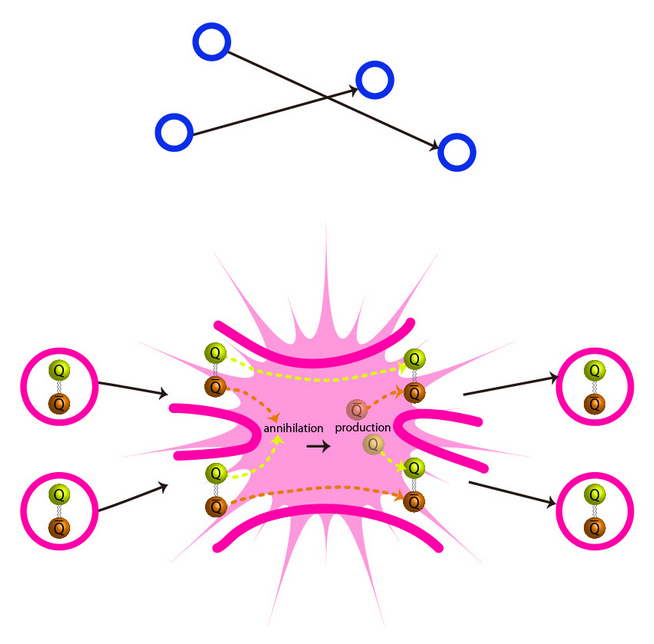 Le teorie convenzionali predicono che le particelle di materia oscura non dovrebbero collidere ma piuttosto ‘scivolar via’ passando l’una accanto all’altra (in alto). Invece, secondo Hochberg et al. le particelle di materia oscura di tipo SIMP (Strongly Interacting Massive Particle) dovrebbero collidere ed interagire l’una con l’altra (in basso). Credit: Kavli IPMU