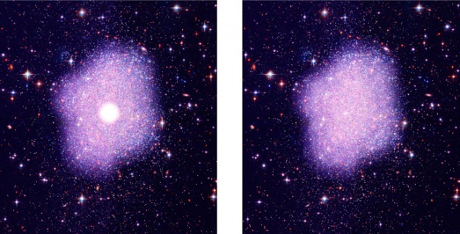 Illustrazione artistica della distribuzione della materia oscura. A sinistra, si assume una distribuzione di materia oscura secondo le teorie più convenzionali in cui si osserva un massimo concentrato in una piccola regione del centro galattico. A destra, la simulazione con materia oscura di tipo SIMP (Strongly Interacting Massive Particle) dove si osserva una distribuzione più diffusa rispetto al centro galattico. Credit: NASA, STScI, Kavli IPMU