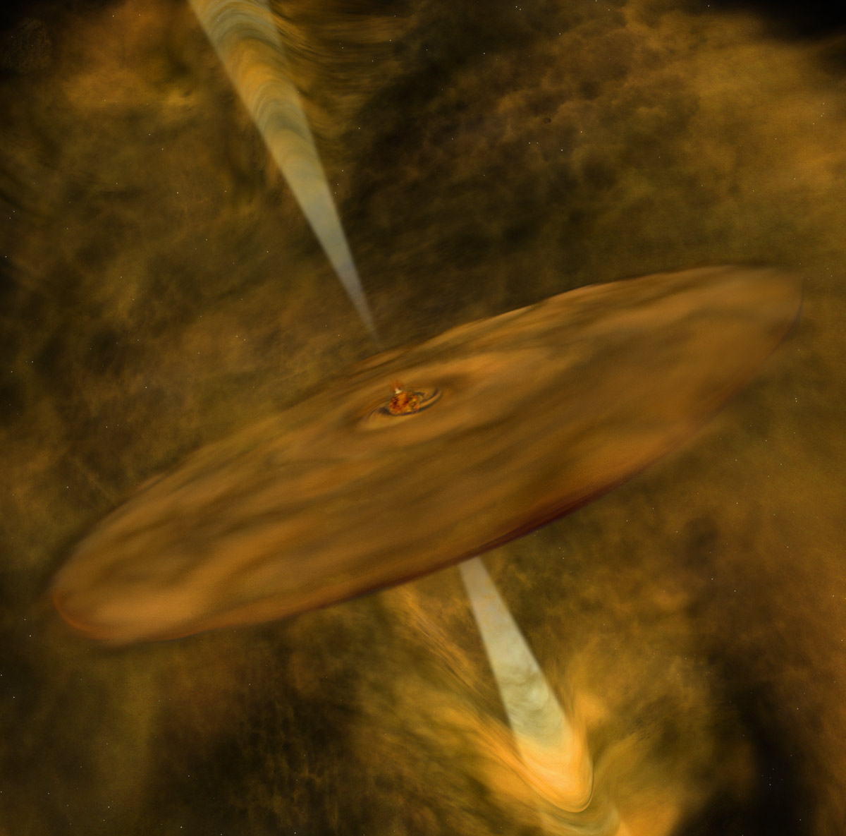 Illustrazione artistica di una nana bruna molto giovane, in fase di formazione. Si osserva un disco che orbita attorno alla nana bruna e due getti di materia che vengono espulsi in direzione opposta lungo i poli del disco. Credit: Bill Saxton, NRAO/AUI/NSF