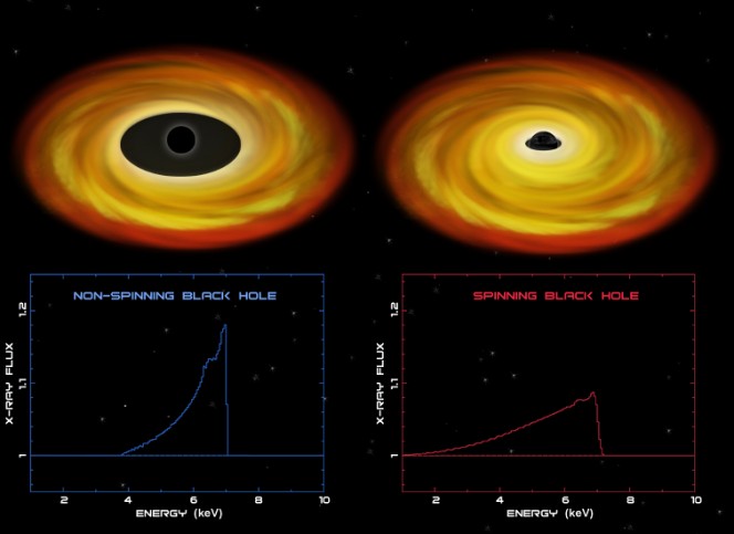 La forma dell’emissione della riga del ferro a 6,4 KeV dipende dalla rotazione del buco nero. Nel caso di un buco nero ruotante, lo spaziotempo trascina il disco di accrescimento estendendolo fino alle regioni più interne, dove gli effetti gravitazionali diventano sempre più intensi. In questo caso, l’emissione della riga del ferro ha un profilo deformato rispetto al caso di un buco nero non-ruotante a causa degli effetti relativistici del forte campo gravitazionale. Questo metodo viene utilizzato per misurare lo spin dei buchi neri. Credit: NASA