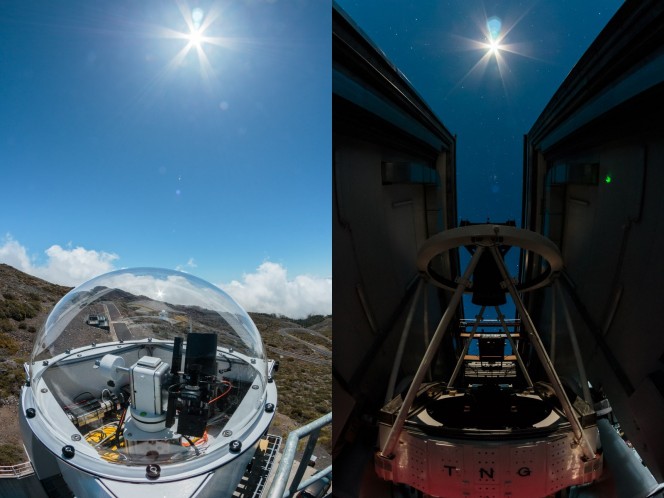 Sinistra: Il piccolo telescopio solare installato sulla parete Sud della cupola del TNG, inizia le osservazioni la mattina per inviare la luce del Sole verso Harps-N. Destra: Osservazioni notturne al TNG con Harps-N e l’Astro Comb. Con l’aggiunta del telescopio solare il turno di lavoro di Harps-N si avvicina alle 24h. (foto: Alex Glenday)