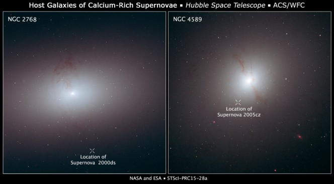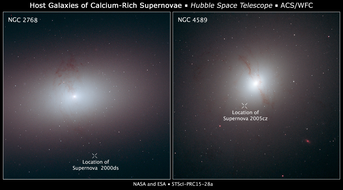 Queste immagini di Hubble mostrano due galassie ellittiche in cui si notano delle righe di polvere scure che rappresentano una chiara evidenza di un recente merger galattico. La polvere è l’unico prodotto residuo di una galassia più piccola che è stata consumata da una galassia ellittica più grande. La “X” indica la posizione delle supernovae che sono associate alle galassie. Queste supernovae vagabonde sono posizionate a diverse distanze dalle rispettive galassie: in questi due casi, SN 2000ds (a sinistra) si trova ad almeno 12.000 anni luce da NGC 2768, che dista 75 milioni di anni luce; SN 2005cz (a destra) si trova a circa 7.000 anni luce da NGC 4589, che dista 108 milioni di anni luce. Entrambe le galassie sono state osservate con la Advanced Camera for Surveys a bordo del telescopio spaziale Hubble. In particolare NGC 4589 è stata ripresa nel 2006 e NGC 2768 nel 2002. Credit: NASA, ESA, e R. Foley (University of Illinois)