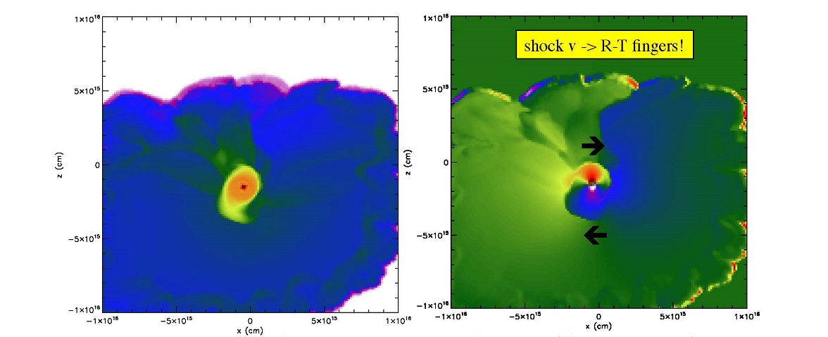 Queste immagini mostrano alcuni momenti delle simulazioni relative al piano centrale di un disco ruotante che orbita attorno a una protostella (puntino nero) secondo un modello 3D del collasso di una nube molecolare di gas e polvere causato dal passaggio di un’onda d’urto. A sinistra è rappresentata la densità, mentre a destra il grafico delle velocità mostra come l’onda d’urto (fronte più esterno) abbia prodotto delle rientranze a forma di dito responsabili della rotazione del disco attorno alla protostella centrale. Crediti: Alan Boss