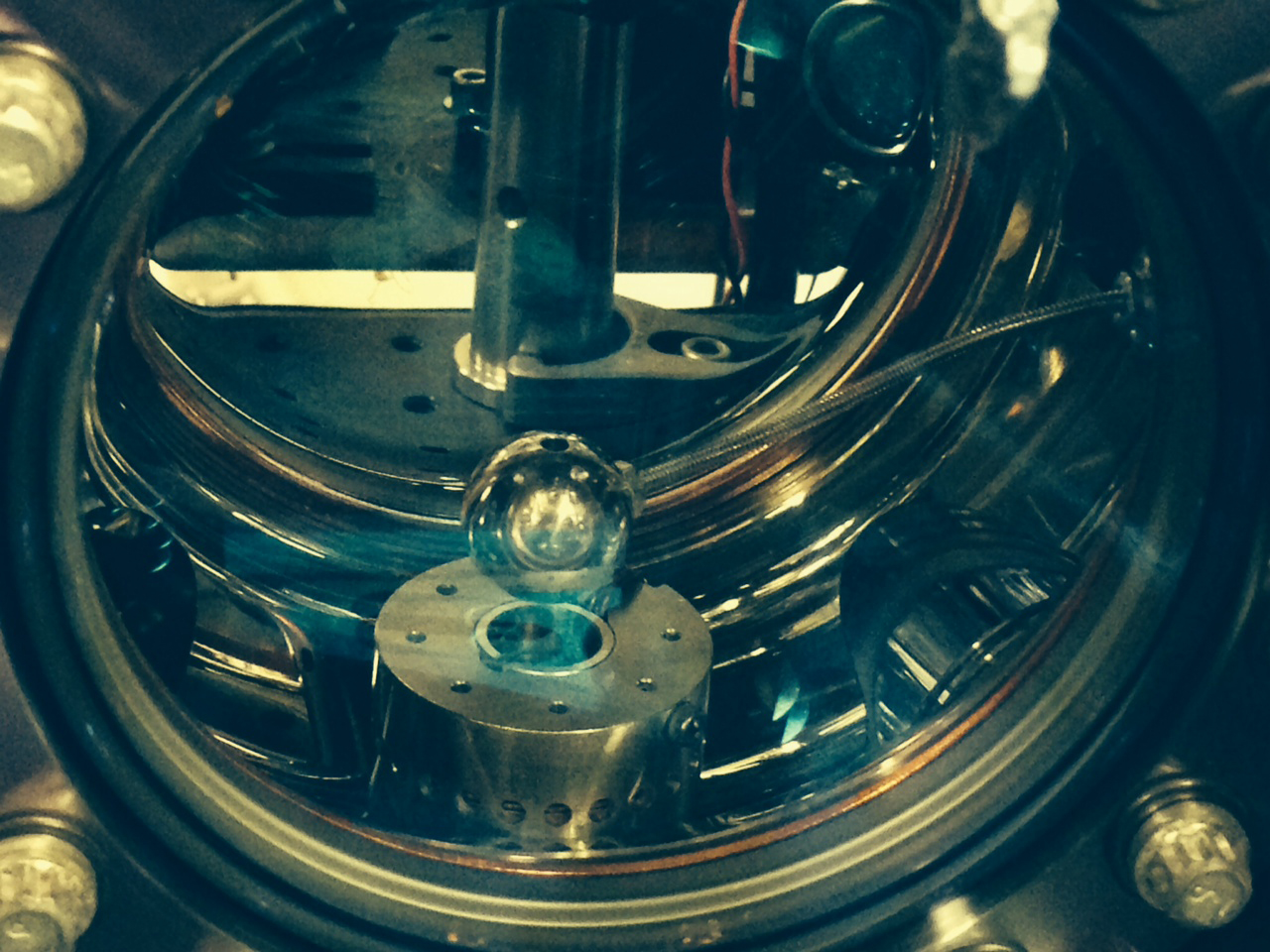 Una fotografia dell’apparato sperimentale. La sfera (al centro) ha un diametro di 25mm. L’esperimento misura la forza che si esercita tra gli atomi e la parte superiore della sfera. Crediti: Holger Müller