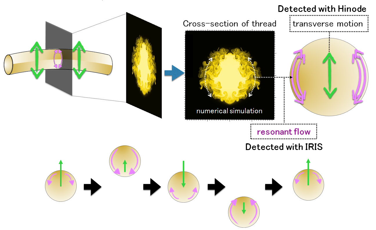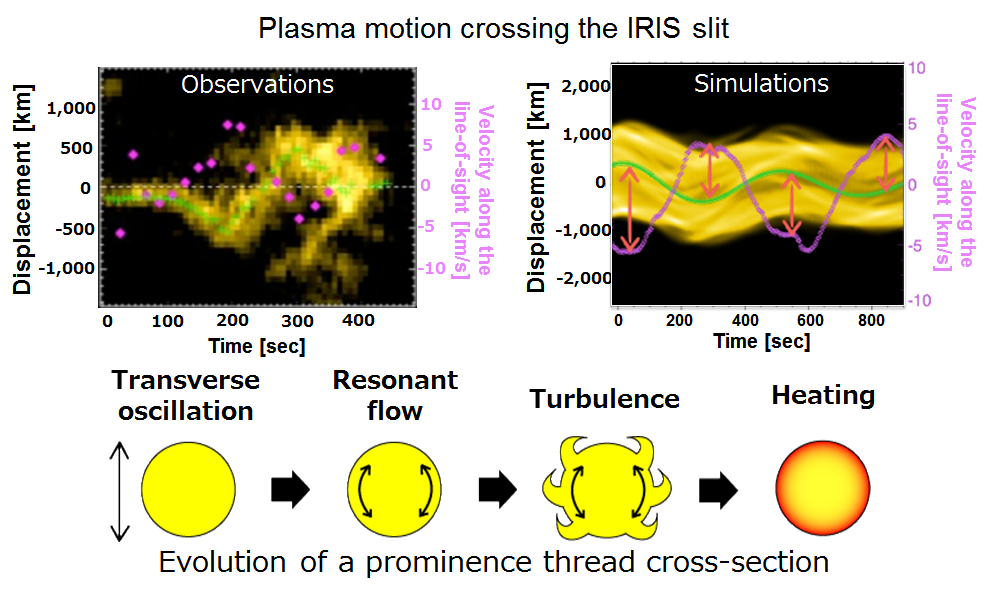 Figura 1. La figura mostra le ‘impronte digitali’ del processo dell’assorbimento risonante. Le onde di Alfvén che si propagano nella protuberanza solare producono oscillazioni trasversali delle strutture dette ‘fili’. Sul grafico, in cui è rappresentato lo spostamento in funzione del tempo, questo moto appare come una struttura a forma ondulata (in giallo nel pannello in alto a sinistra). Le onde risuonano e producono un caratteristico moto di torsione che è stato rivelato da IRIS (i puntini color porpora). Questo flusso diventa poi turbolento e riscalda il plasma. Le simulazioni numeriche 3D relative ad una struttura ‘filo’ di una protuberanza oscillante (il pannello in alto a destra) riproducono con successo questo processo. Nel pannello in basso, è rappresentata l’evoluzione temporale della sezione di una struttura detta ‘filo’. Credit: JAXA/NAOJ
