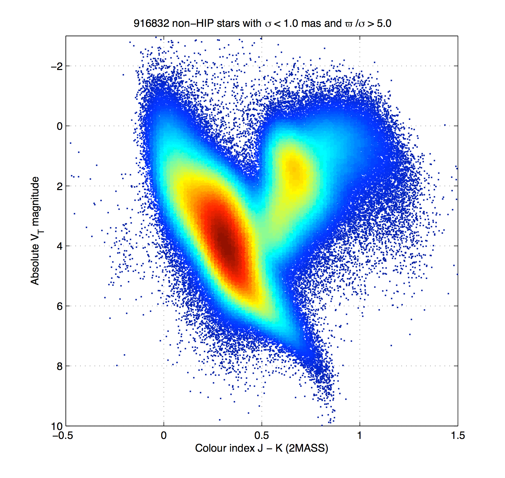 L’Universo secondo Gaia. La missione astrofisica di ESA, che ambisce a produrre una mappa tridimensionale della nostra galassia e che in cinque anni di missione studierà oltre un miliardo di oggetti, ci regala due affascinanti immagini in dati. Si tratta di due diagrammi di Hertzsprung-Russell, ottenuti grazie ai dati provvisori della Tycho-Gaia Astrometric Solution, la distanza delle stelle la cui parallasse presenta rispettivamente un margine di incertezza inferiore al 20% (in alto) e al 10% (qui sotto), è stata utilizzata per convertire la magnitudine apparente Tycho-2 in magnitudine assoluta sull’asse y. I due diagrammi di Hertzsprung-Russell rappresentano un primo test della capacità astrometrica di Gaia. Anche se basati sui dati raccolti nel corso di osservazioni routinarie, queste immagini ci anticipano un po’ delle emozioni che la missione ha promesso di regalarci.