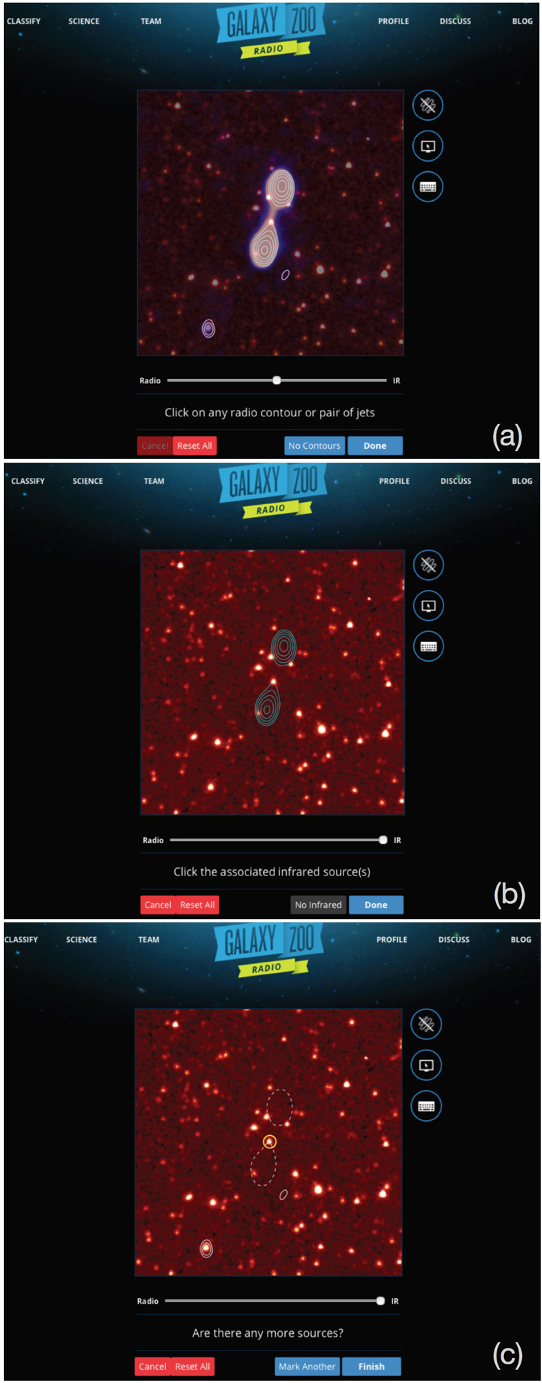 I tre passaggi richiesti per compiere una classificazione usando l’interfaccia di Radio Galaxy Zoo: (a) selezionare la componente radio d’una singola sorgente; (b) selezionare la galassia all’infrarosso a essa associata; (c) passare alle successive sorgenti radio presenti nell’immagine. Fonte: radio.galaxyzoo.org
