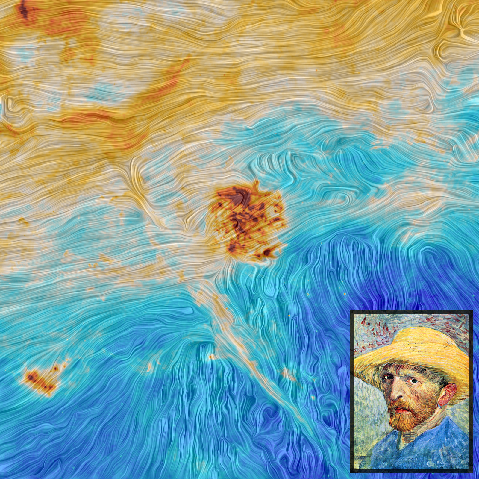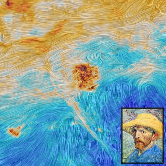 Le Nubi di Magellano nell’obiettivo del satellite ESA Planck (crediti: ESA e Planck Collaboration), a confronto con uno dei più celebri autoritratti di Van Gogh.