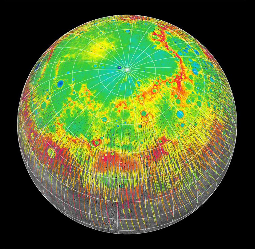 I profili d’elevazione (rosso: alto, blu: basso) dell’emisfero nord di Mercurio ottenuti dall’altimetro laser a bordo di MESSENGER, usati nel nuovo studio per determinar la velocità di rotazione del pianeta. Crediti: NASA/Johns Hopkins University Applied Physics Laboratory/Carnegie Institution of Washington/DLR