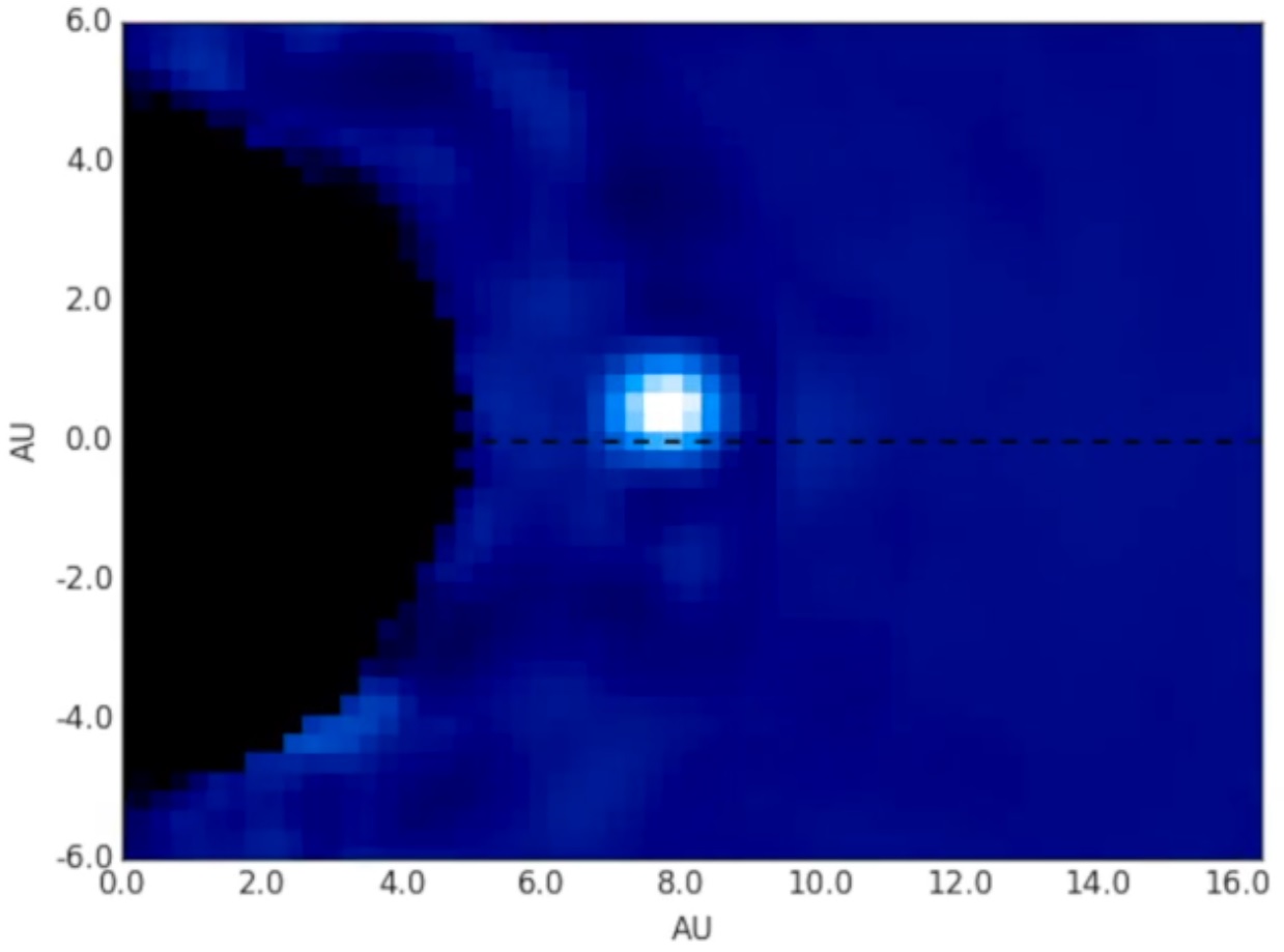 Un fotogramma dell’animazione: al centro, l’esopianeta Beta Pictoris B, come appare dalle riprese del Gemini Planet Imager (GPI) installato al telescopio Gemini South sulle ande cilene. Crediti: Maxwell Millar-Blanchaer