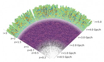 DESI esplorerà un volume molto grande dello spazio, 10 volte maggiore rispetto alla survey BOSS, e misurerà il redshift di determinate classi di oggetti, producendo dopo 5 anni una mappa 3D dell’Universo. Credit: DESI/LBL