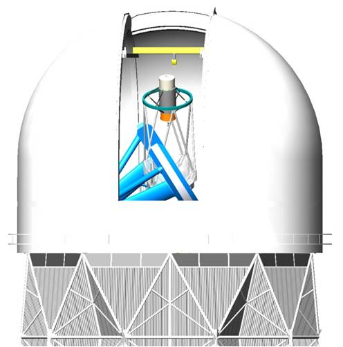 Illustrazione del telescopio di 4m Mayall situato al Kitt Peak National Observatory con lo strumento DESI nel fuoco primario. Credit: DESI/KPNO/LBL
