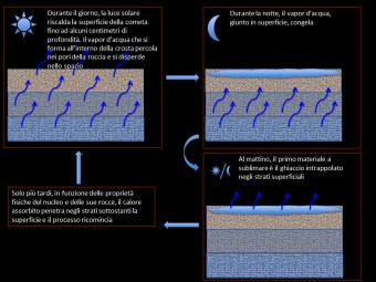 Secondo i ricercatori che hanno partecipato allo studio, molti dei quali dell’INAF, i dati mostrano che, quando un’area del nucleo è illuminata, il ghiaccio d’acqua presente in superficie e fino ad alcuni centimetri di profondità sublima, trasformandosi in gas e allontanandosi dalla cometa. Al ruotare della cometa, la regione entra poi nella zona d’ombra e così la sua superficie si raffredda rapidamente, mentre gli strati sottostanti, meglio protetti, mantengono più a lungo il calore accumulato nelle ore precedenti. Così, il ghiaccio d’acqua appena sotto la superficie continua a sublimare e risalire verso l’esterno, facendosi strada nella struttura porosa delle rocce del nucleo. Una volta raggiunta la superficie ormai fredda, il vapor d’acqua si solidifica ancora, creando così un nuovo strato di ghiaccio, che sublimerà quando il sole tornerà a splendere su quella zona.