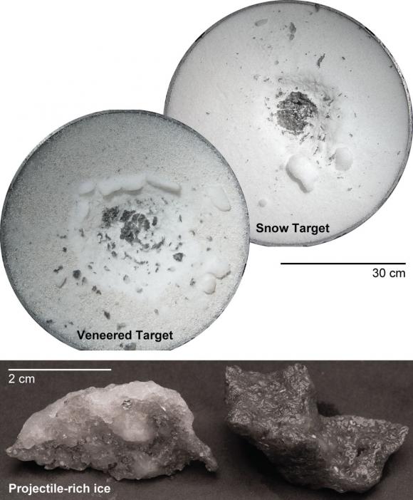 Per simulare il silicato poroso i ricercatori hanno utilizzato una polvere di pomice. Per il ghiaccio hanno usato due bersagli: uno composto esclusivamente da neve, e l’altro con neve ricoperta da uno strato di silicati. Hanno poi colpito questi bersagli con frammenti di basalto e alluminio, simulando sia meteoriti rocciosi che metallici.