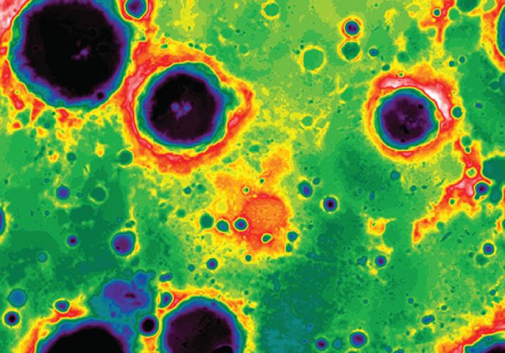 Rappresentazione topografica del Bacino South Pole-Aitken, dove il colore rosso rappresenta le elevazioni e il blu le depressioni. Mafic Mound, l’area rossastra nel centro, si innalza per 800 metri rispetto alla superficie circostante. Crediti: NASA/Goddard/MIT/Brown