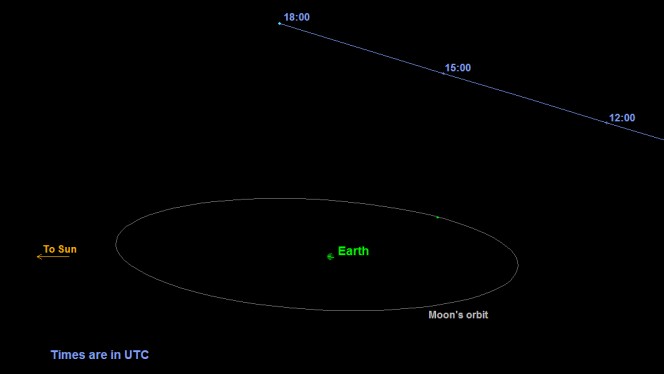 L’immagine raffigura l’orbita dell’asteroide 2015 TB145, che il 31 ottobre prossimo passerà vicino alla Terra, a una distanza pari a 1.3 volte quella della Luna. Le ore sono espresse in UTC. Crediti: NASA/JPL-Caltech