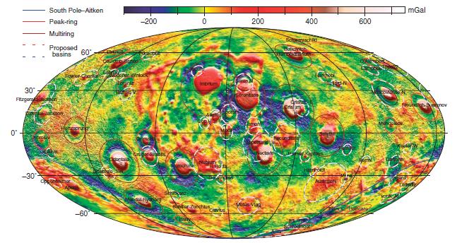 Una mappa in codice colore delle variazioni gravitazionali registrate da GRAIL. I dati sono espressi in Gal (Galileo), un’unità di misura per l’accelerazione utilizzata per misure di gravità. I cerchi rosso/bianchi mostrano i bacini aventi un solo anello topografico mentre quelli blu/bianchi indicano i bacini che non hanno un anello topografico ben definito, ma che sembrano essere bacini dalle variazioni gravitazionali registrate da GRAIL. Crediti: Neumann et al.