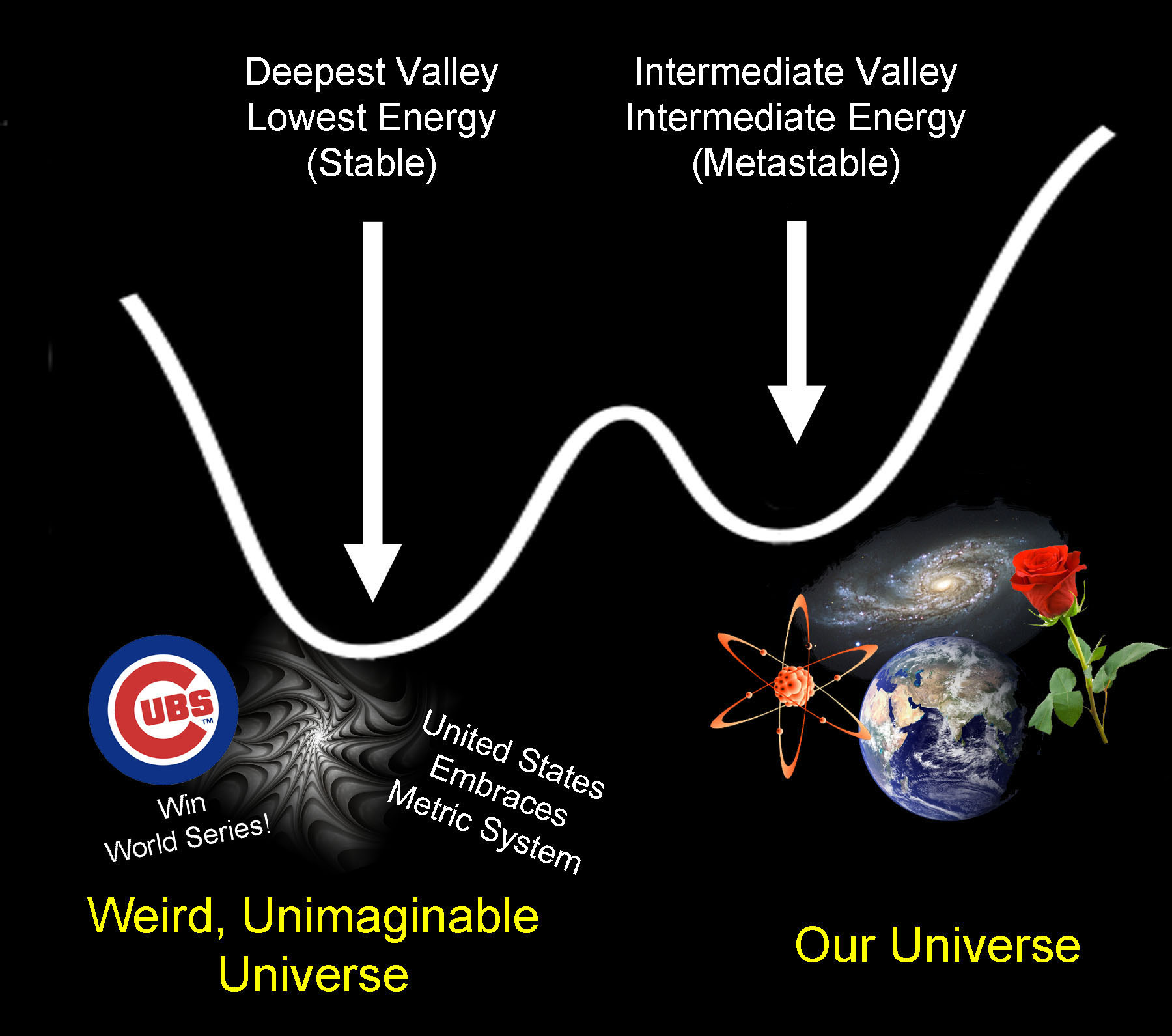 E se fosse metastabile, come pare che sia? Be’, la situazione sarebbe quella che vedete nella figura qui a fianco: apparentemente tranquilla, adagiato com’è in fondo a una conca, ma essendoci un avvallamento ancora più profondo – quello, appunto, della stabilità – non c’è garanzia che, prima o poi, qualcosa non lo sposti dal raggiunto equilibrio per farlo scivolare laggiù. Insomma, la metastabilità è una sorta di stabilità con la spada di Damocle. Ora, per quanto uno scossone talmente forte da scollarlo dalla prima conca possa apparire un’eventualità improbabile, vista l’apertura della meccanica quantistica anche agli stati più improbabili e considerata l’enormità di tempo a disposizione… insomma, noi magari no, ma fossimo un placido quark cresciuto con l’illusione di poter esistere per sempre, ecco, per lui qualche brivido sarebbe giustificato.