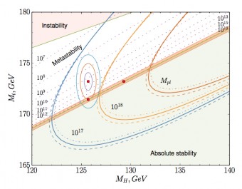 Ed è proprio su un valore di soglia di questo confine che si concentrano i calcoli di Bednyakov e colleghi. La loro analisi della stabilità del vuoto, svolta applicando complesse correzioni ai valori già noti, giunge a stimare un limite superiore per la massa critica del quark top – ovvero, la massa che lo porrebbe esattamente sulla linea di confine fra vuoto stabile e metastabile – compatibile, tenendo conto degli errori, con il valore effettivamente misurato per il quark top. Il che significa, scrivono gli autori nelle conclusioni, che sì, è vero, secondo il Modello Standard l’universo ne esce metastabile. Ma non si può escludere che, se i valori delle masse del bosone di Higgs e del quark top si discostano anche solo di poco dalle stime attuali, l’universo possa in realtà risultare stabile.