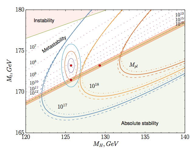 Allorché il meccanismo di Higgs entra in azione, si verifica la cosiddetta rottura della simmetria del campo elettrodebole. E i fermioni – quark e leptoni – acquistano massa. Quanta massa? Dipende da quanto interagiscono con il nuovo arrivato, il campo di Higgs. Il fermione che interagisce di più è il quark top, che si ritrova infatti con una massa di tutto rispetto, stimata attualmente attorno ai 173 GeV. Un numero cruciale, questo, perché insieme al valore della massa del bosone di Higgs, quell’oramai mitico 125.7 GeV annunciato al CERN, rappresenta la chiave per calcolare la stabilità del vuoto, e dunque dell’universo.