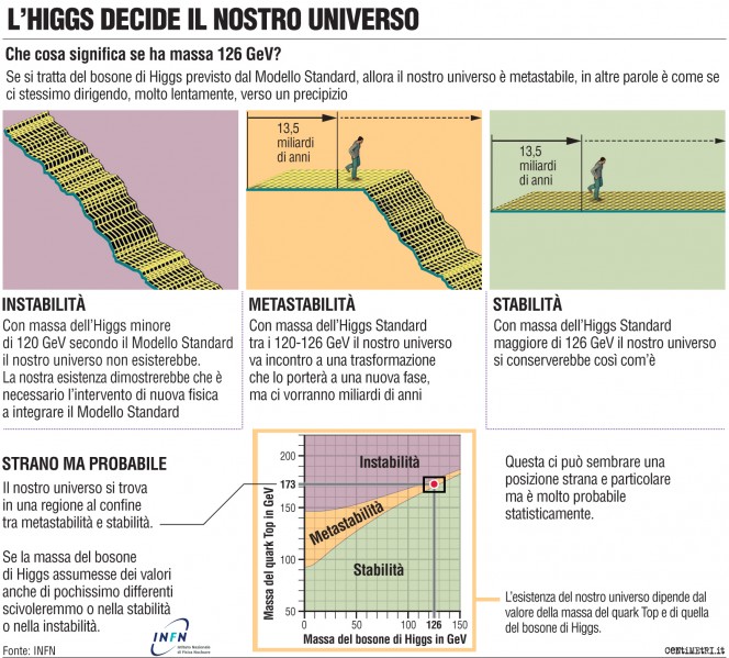 Avendo escluso l’instabilità, com’è dunque l’universo: stabile o metastabile? La decisione è stata presa parecchio tempo addietro: circa 14 miliardi di anni fa, per l’esattezza un centesimo di miliardesimo di secondo dopo il big bang. La possibilità di offrire una risposta, invece, è molto più recente: diciamo che possiamo provarci, senza tirare troppo a indovinare, solo da mercoledì 4 luglio 2012. Ovvero, da quando gli scienziati di LHC hanno annunciato al mondo, dall’aula magna del CERN, d’aver catturato il bosone di Higgs. Il perché è presto detto: il meccanismo di Higgs scese in campo per la prima volta proprio un centesimo di miliardesimo di secondo dal fischio d’inizio, quando la temperatura dell’universo scese al di sotto d’una certa soglia.