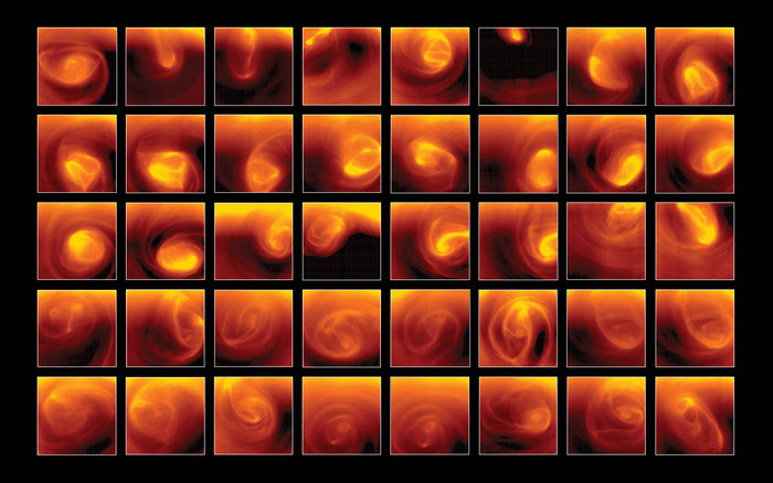 Di particolare interesse per gli scienziati proprio l’atmosfera di Venere, la più densa di tutto il Sistema solare e composta per la maggior parte da anidride carbonica. Venere è anche avvolto da uno spesso strato di nuvole composte da acido solforico. Questa combinazione di gas con lo strato di nubi perenne ha portato ad un riscaldamento serra enorme, portando la temperatura superficiale di Venere poco oltre i 450ºC. Ma soprattutto la densità di nuvole e atmosfera ha da sempre nascosto ai nostri occhi il pianeta, impenetrabile dai telescopi a terra. Particolare fenomeno è quello dei venti che soffiano più in alto delle nuvole soffiano a 400 chilometri orari, quindi 60 volte più veloce della rotazione planetaria, con fenomeni quali i famosi vortici polari. Nel corso degli anni la sonda Venus Express ha dimostrato che i vortici polari di Venere sono tra i più variabili del Sistema solare. Questa serie di immagini riprende proprio i venti che soffiano al polo sud del pianeta e sono state scattate da VIRTIS da febbraio 2007 (in alto a sinistra) ad aprile 2008 (in basso a destra). La forma dell’ “occhio” del vortice, che spesso va dai 2000 ai 3000 chilometri, cambia repentinamente per cause ancora non totalmente chiare.