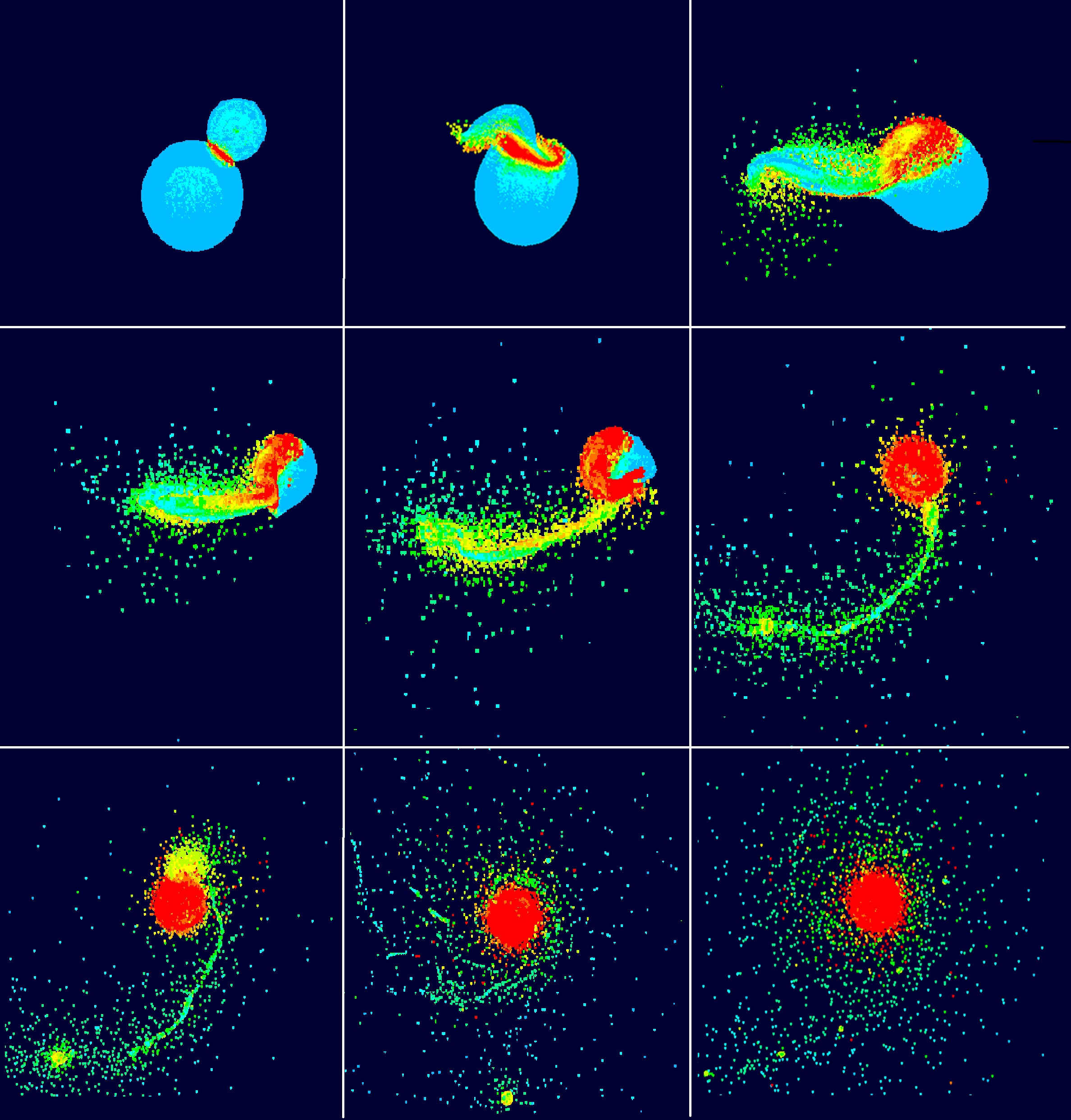 Fotogrammi tratti dalla simulazione della collisione tra la nascente Terra e un protopianeta delle dimensioni di Marte, dove i colori indicano la temperatura delle particelle. Crediti: R. Canup, SwRI