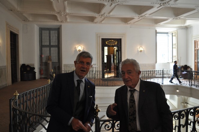 Dopo la Relazione di apertura del neo Presidente Alberto Quadrio Curzio si sono svolte due cerimonie. Sono stati infatti conferiti ai nuovi Soci Nazionali, ai nuovi Soci Corrispondenti e ai nuovi Soci Stranieri i distintivi e le pergamene di elezione e di nomina. Tra i nuovi soci nazionali l’ex presidente dell’INAF, Giovanni Bignami, che sostituisce nella componente astronomica la compianta Margherita Hack. Lo vediamo nella foto con il primo Presidente dell’Istituto Nazionale di Astrofisica Giancarlo Setti, segretario generale dell’Accademia dei Lincei.