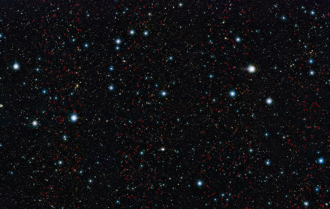 Le galassie massicce appena scoperte sono indicate in questa immagine del campo UltraVISTA. Crediti: ESO/UltraVISTA team. Acknowledgement: TERAPIX/CNRS/INSU/CASU