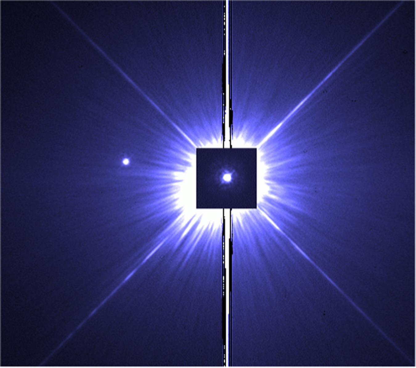 Immagine Hubble di Procione A ottenuta con un’esposizione di 0.14 secondi (nel riquadro centrale) sovrapposta a una posa di 100 secondi che evidenzia sulla sx Procione. Crediti: APJ/ Bond et al. 2015