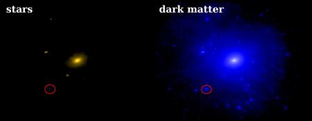 Le galassie nane possiedono poche stelle e una percentuale elevata di materia oscura. In questa simulazione generata dal FIRE (Feedback in Realistic Environments) al Caltech viene mostrata la distribuzione di stelle predetta (a sinistra) e quella della materia oscura (a destra) attorno ad una galassia come la Via Lattea. Il cerchio rosso mostra una galassia nana come Triangulum II. Anche se essa possiede una percentuale elevata di materia oscura, la galassia ha poche stelle. Questo tipo di galassia nana rappresenta un ottimo banco di prova per rivelare raggi gamma riconducibili ai processi di annichilazione delle particelle di materia oscura. Credit: A. Wetzel and P. Hopkins, Caltech